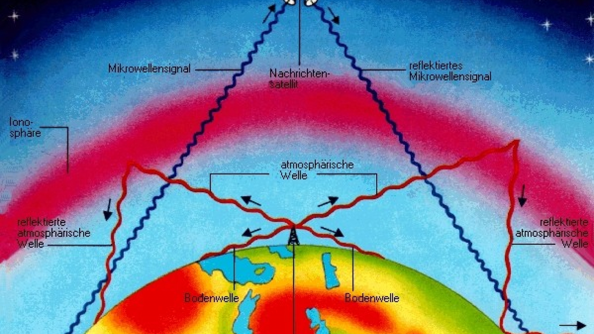 Rundfunksender strahlen die von ihnen ausgehenden Wellen in alle Richtungen ab. Atmosphärische Wellen pflanzen sich geradlinig in die Atmosphäre fort, bis sie auf die als Reflektor wirkende Ionosphäre treffen, von der sie wieder zur Erde zurückreflektiert werden. Diese reflektierten Wellen ermöglichen somit Rundfunkempfang auch an Orten, die weiter als Sichtweite vom Sender entfernt liegen. Bei nochmaliger Reflexion der Radiowellen zwischen Erdoberfläche und Ionosphäre können große Reichweiten erzielt werden (bis über 20 000 km). Die sogenannten Bodenwellen breiten sich dagegen parallel zum Erdboden aus. Sie können deshalb kaum an Orten empfangen werden, die außerhalb Sichtweite vom Sender liegen. Mikrowellen werden von der Ionosphäre nicht reflektiert. Sie strahlen vom Sender geradlinig in den Weltraum ab und dienen so dem Nachrichtenverkehr mit Satelliten oder via Satellit mit Empfangsstationen auf der Erde.