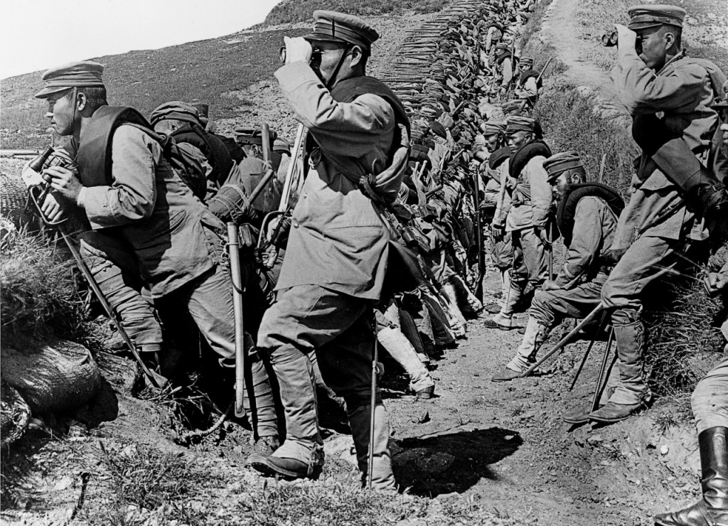 Japanische Soldaten erwarten 1904 in der Mandschurei