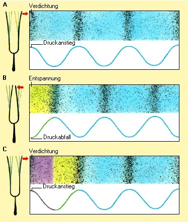 Eine Schallwelle besteht aus einer Reihe sich im Ausbreitungsmedium fortpflanzender Schwingungsbäuche und Schwingungsknoten. Die Abbildung zeigt in vereinfachter Form, was mit den Luftmolekülen in der Nähe einer schwingenden Stimmgabel vor sich geht (farbige Wellenbewegungen). Gleichzeitig gibt sie über den Wellenbewegungen die jeweiligen Druckverhältnisse in den einzelnen Wellenabschnitten an.