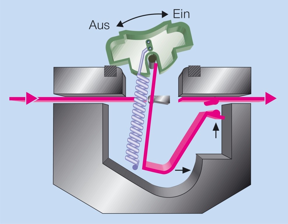 mechanisches Gerät zum mehrmaligen Ein- und Ausschalten des Stromflusses in elektrotechnischen Geräten und Starkstromanlagen. Je nach ihrer Wirkungsweise unterscheidet man Stell-, Tast- und Schlossschalter: Bei Stellschaltern (z. B. Walzen- und Nockenschalter) wirkt auf die beweglichen Schaltstücke keine Rückzugskraft, so dass sie von selbst in jeder Schaltstellung verbleiben; Schlossschalter verbleiben im eingeschalteten Zustand mittels eines Schaltschlosses, das zudem bei einem Auslösebefehl kein Einschalten zulässt (Freiauslösung); Tastschalter besitzen keinerlei Sperre, so dass sie bei Wegnahme der Antriebskraft in ihre Ausgangslage zurückkehren. Je nach ihrem Schaltvermögen werden Leerschalter (die nur in stromlosem Zustand geschaltet werden), Lastschalter (die einen Strom in Höhe des Nennwertes ein- und ausschalten), Leistungsschalter (die Kurzschlussströme ausschalten können) und (allpolig schaltende) Motorschalter unterschieden.