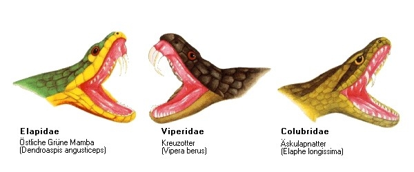 Die Giftschlangen werden nach der Stellung ihrer Giftzähne in drei Familien eingeteilt: Elapidae, Viperidae und Colubridae. Die Abbildung zeigt je eine typische Art.