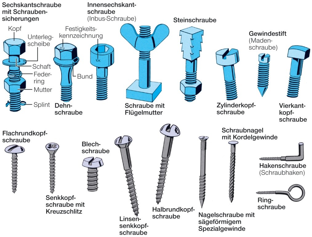 Maschinenelement mit Gewinde, besteht aus zwei zusammenwirkenden Teilen, dem Schraubenbolzen (Schraubenspindel) und der Schraubenmutter oder nur aus dem Schraubenschaft; dient u. a. zur Herstellung lösbarer Verbindungen, zur Ausübung von Kräften oder zur Bewegungsübertragung.