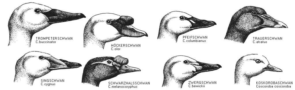 CygnusGattung der Gänse, mit langem Hals. Sie leben in strenger Einehe und bauen ihr Nest an oder auf Gewässern. Die bekanntesten Arten sind der häufig als Parkgeflügel gehaltene Höckerschwan, Cygnus olor, mit einem Höcker am Schnabelansatz; der gelbschnäbelige Singschwan, Cygnus cygnus; der kleinere Zwergschwan, Cygnus bewickii; der schwarzhalsige Cygnus melanocoryphus aus Südamerika und der australische Trauerschwan, Cygnus atratus.