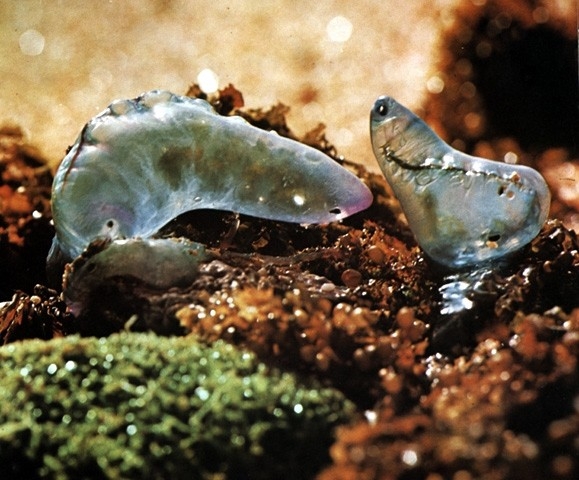 Die große Gasblase der Portugiesischen Galeere, die hier im Spülsaum mit Algen angeschwemmt wurde, wird vom Gründungspoloyp gebildet. Sie ist von einer chitinigen Hülle umgeben, wird von einer Gasdrüse je nach Bedarf gefüllt und dient als Schwimmkörper.