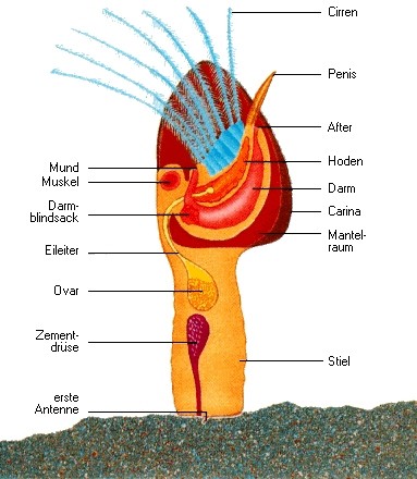 Seepocken können dem Substrat direkt aufsitzen oder daran mit einem Stiel angeheftet sein, wie etwa bei der Entenmuschel. Der Stiel der Entenmuschel trägt das Capitulum, den eigentlichen Körper, der von Kalkplatten umschlossen ist.