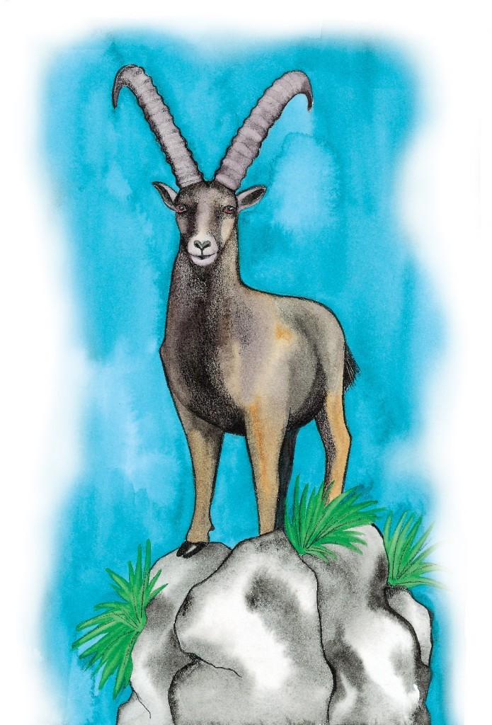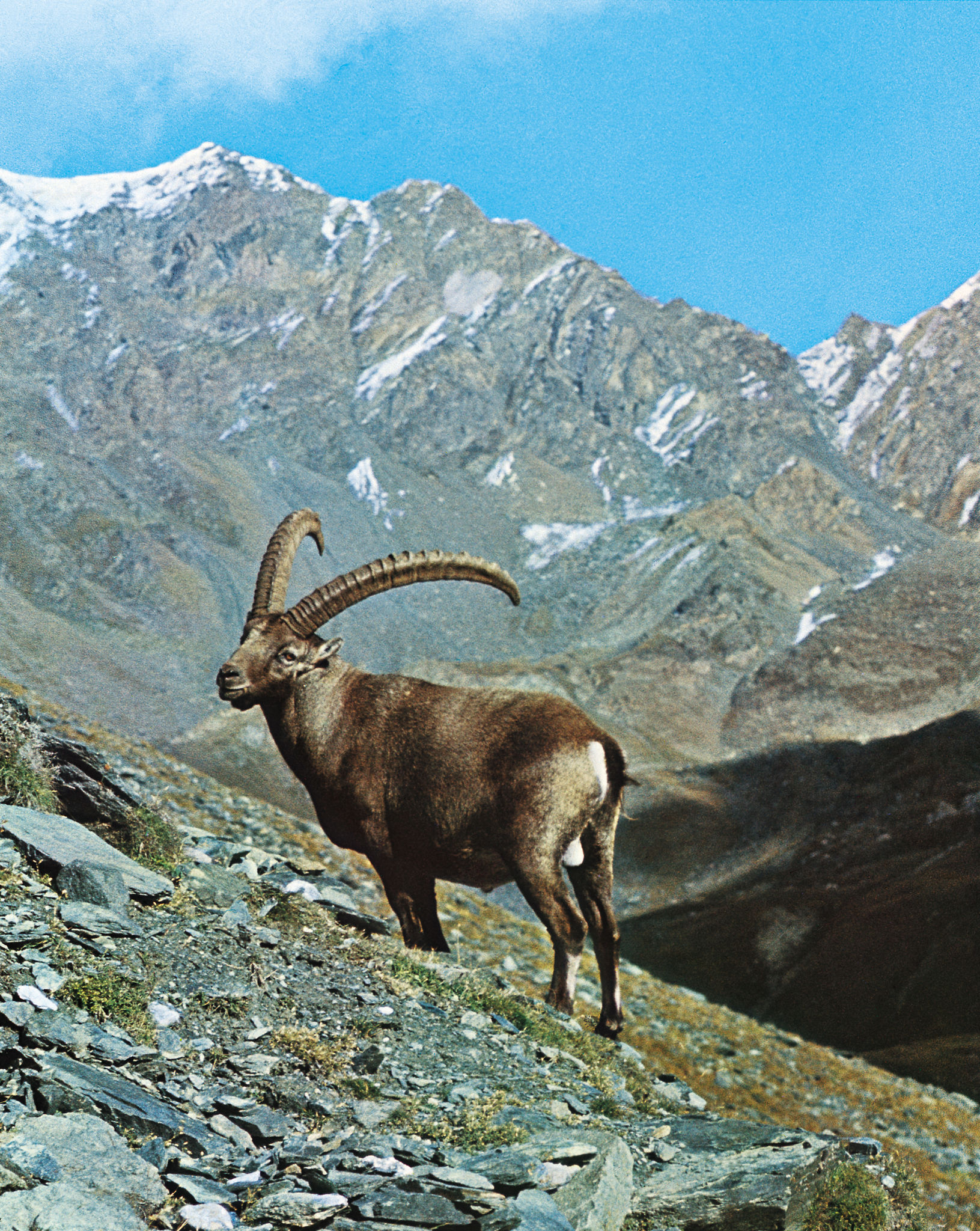 Capra ibexArt der Ziegen mit mehreren Unterarten, von denen der Alpensteinbock, Capra ibex ibex, die bekannteste ist. Alle Steinböcke sind gewandte Kletterer, die in den Hochgebirgen Europas, Asiens und Nordostafrikas in verschiedenen Formen inselartig verbreitet sind. Sie sind gut an die rauen Verhältnisse oberhalb der Baumgrenze angepasst; nur im Winter und Frühjahr kommen sie in tiefere Lagen herunter. Die Männchen tragen etwa 1 m lange, nach hinten gebogene Hörner, die sie in ritualisierten Rivalenkämpfen einsetzen; die Hörner der Weibchen sind wesentlich kürzer. Der Spanische Steinbock, Capra pyrenaica, gilt als eigenständige Art. Er ist in seinem Verbreitungsgebiet auf der Iberischen Halbinsel nahezu ausgerottet.