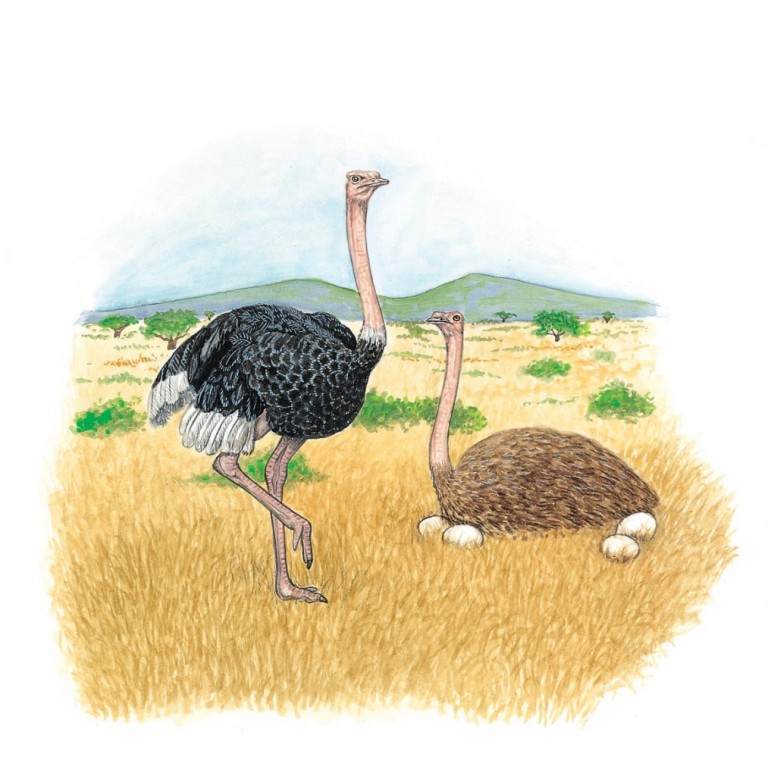 Der große afrikanische Laufvogel zählt zu den Flachbrustvögeln. In der Balz stellt das Straußenmännchen seine weißen Schmuckfedern zur Schau. Hier nimmt es mit geducktem Kopf gerade die Demutsstellung ein.