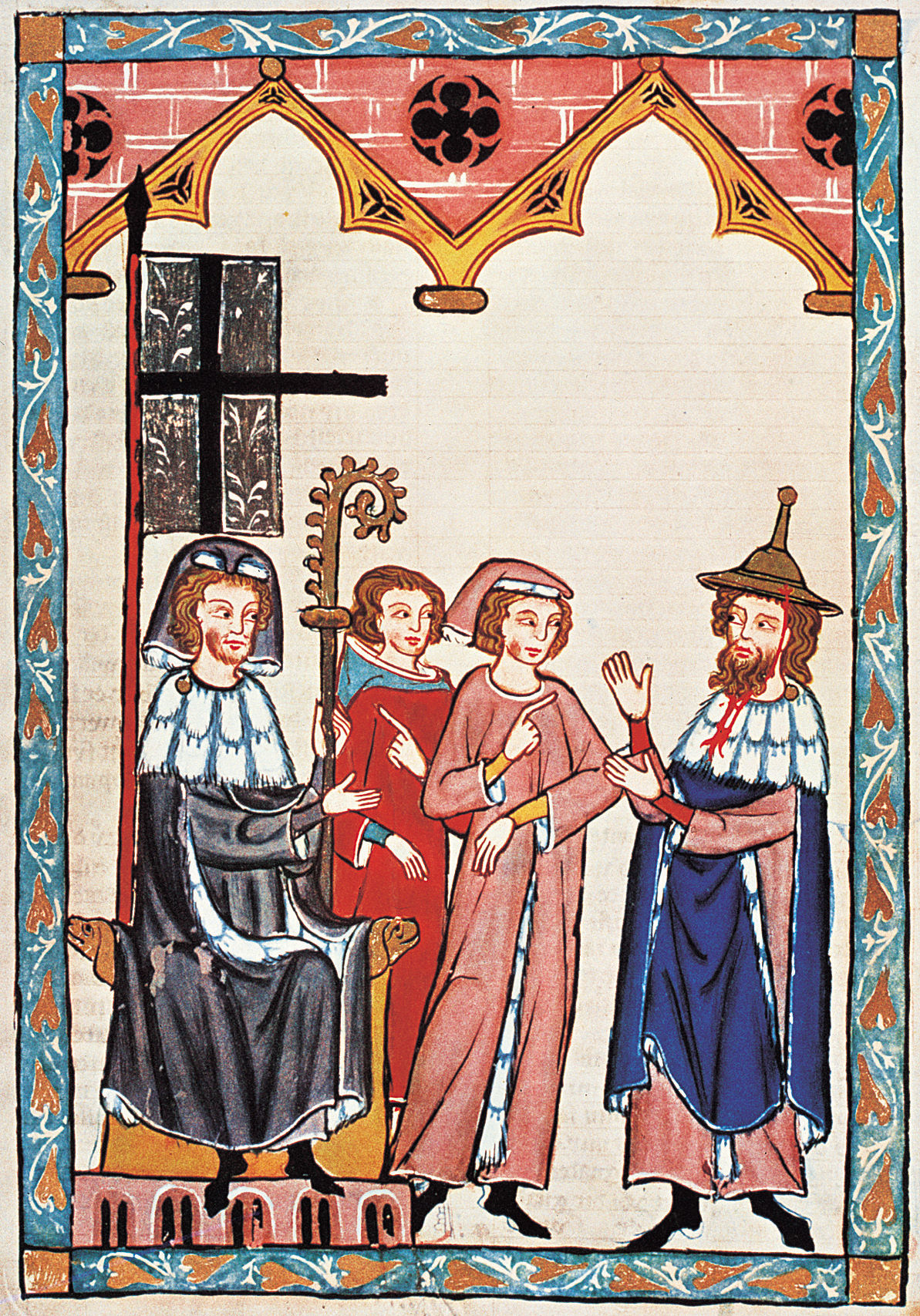 Süßkind von Trimberg, einziger jüdischer Minnesänger, rechts mit dem Judenhut; Manessische Liederhandschrift um 1300–1340; Heidelberg, Universitätsbibliothek