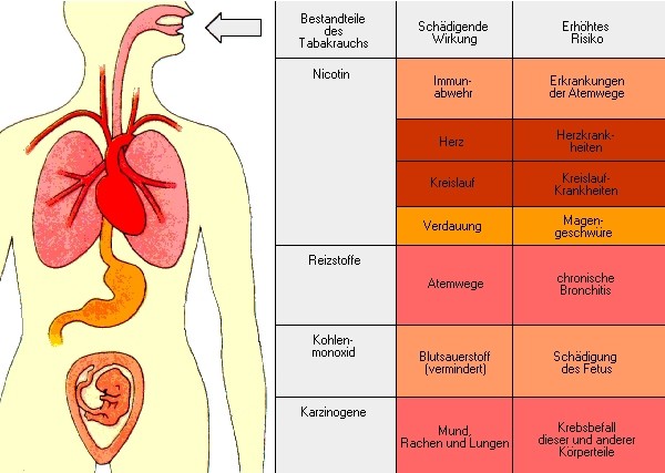 Die Wirkung des Tabakrauchs ist in höchstem Maße gesundheitsschädlich. Seine Hauptbestandteile Nicotin, Reizstoffe, Kohlenmonoxid und krebserregende (karzinogene) Stoffe greifen direkt die Atemwege (Mund, Rachen und Lungen) an, außerdem indirekt Herz, Kreislauf und Magen sowie den Fetus im Mutterleib.