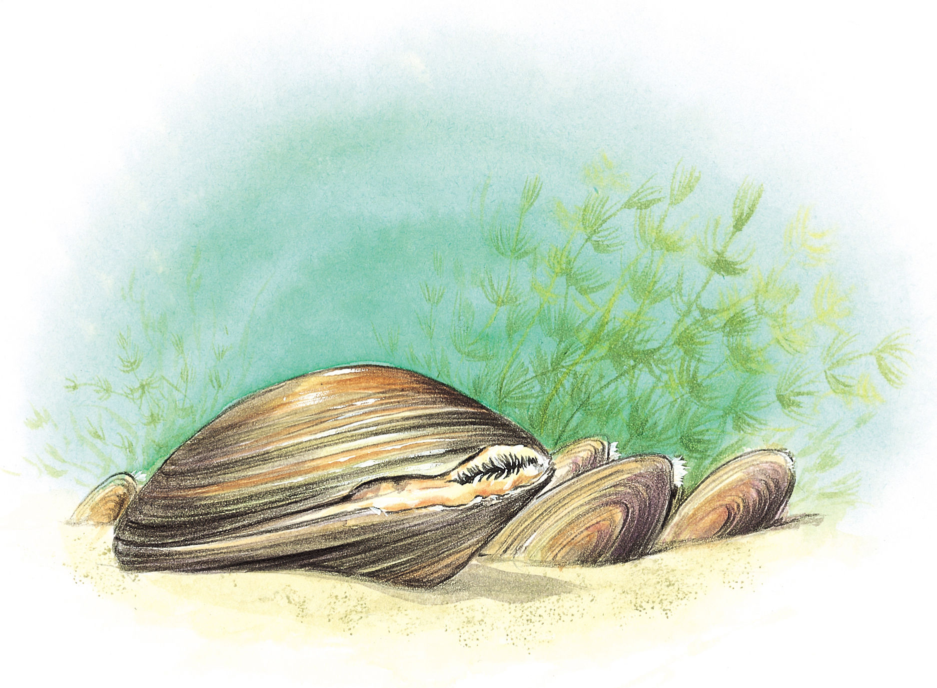 Muscheln - hier die Teichmuschel - erfüllen eine wichtige Aufgabe im Gleichgewicht der Natur: Durch ihre Filtertätigkeit reinigen sie die Gewässer. Durch die Kiemen einer einzigen Muschel können pro Stunde bis zu 40 l Wasser strömen.