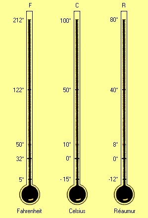 Thermometerskalen mit Fahrenheit-, Celsius- und Réaumur-Einteilung