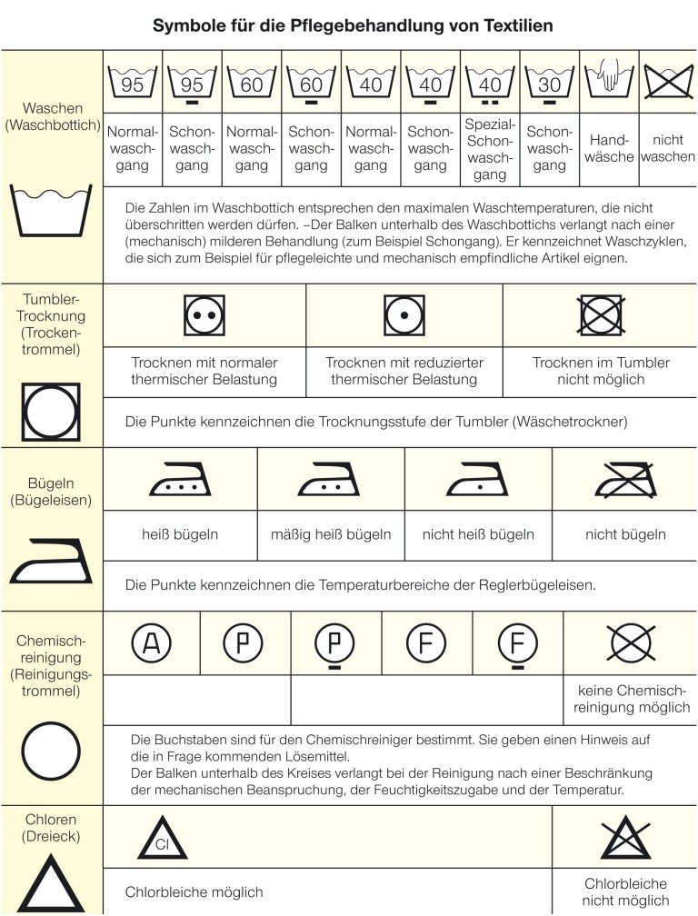 Symbole für die Pflegebehandlung von Textilien