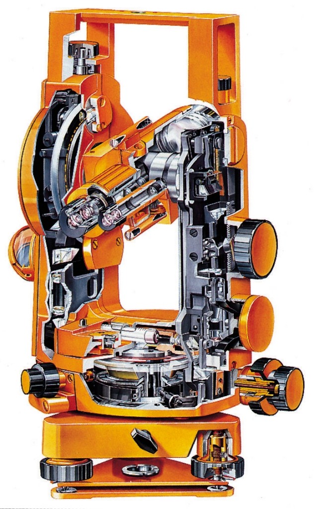 Der Theodolit ist ein optisch-mechanisches Präzisionsinstrument zur Winkelmessung. Um kleinere Höhenunterschiede zwischen zwei Punkten zu bestimmen, benutzt man einen Theodoliten zusammen mit einer Messlatte, auf der eine Metereinteilung angebracht ist. Der Theodolit wird am Punkt A so aufgestellt, dass seine Achse genau horizontal liegt. Man stellt nun die Messlatte zunächst direkt vor den Theodoliten und liest die entsprechende Meterzahl ab, die im Fadenkreuz erscheint. Anschließend bringt man die Messlatte zum Punkt B und liest nun erneut die Meterzahl mit dem Theodoliten ab. Die Differenz von beiden ergibt den Höhenunterschied.