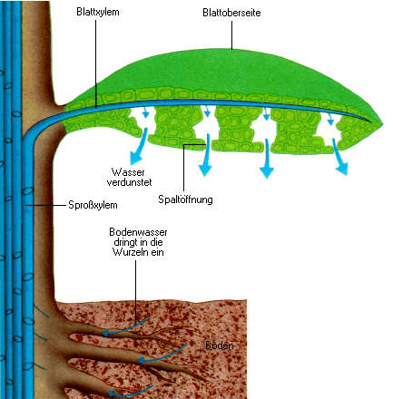 Transpiration wirkt wie eine Saugpumpe, unter deren Einfluss Wasser in den Xylemgefäßen der Pflanzen von den Wurzeln zu den Blättern hochgesaugt wird. Der Druck reicht aus, um das Wasser auch in die Wipfel der höchsten Bäume zu transportieren. Die Spaltöffnungen sind von zwei Randzellen umgeben, die sie öffnen und schließen.