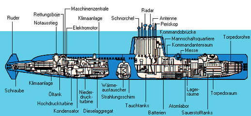 Kurzwort U-Boot; Tauchbootein Kriegs- oder Forschungsschiff, das unter Wasser fahren kann. Das Tauchen erfolgt durch Aufnahme von Wasserballast in Tauchtanks. Angetrieben wird das Unterseeboot über Wasser durch Dieselmotoren, unter Wasser durch Elektromotoren, die aus Akkumulatoren oder Brennstoffzellen gespeist werden. Seit Einführung des Schnorchels (Steigrohr) zur Luftzufuhr ist in geringer Tiefe auch Unterwasserfahrt mit Dieselmotoren möglich. Seit 1954 (Atomunterseeboot „Nautilus“, USA) gibt es auch Unterseeboote mit Kernenergieantrieb. Während des Tauchens gestatten ausfahrbare Sehrohre (Periskope) die Beobachtung der Wasseroberfläche. Die Größe (Wasserverdrängung) von Unterseebooten beträgt bis zu 25 000 ts, die Geschwindigkeit 25 kn über Wasser, 15–20 kn unter Wasser (Atomunterseeboote bis 30 kn über und unter Wasser), die Tauchtiefe 150 m (Atomunterseeboot 300–500 m), der Aktionsradius 150 sm in getauchtem Zustand (bei Atomunterseebooten teilweise mehr als 100 000 sm). Die Bewaffnung besteht aus Torpedos, früher 1–2 Geschützen sowie Flugabwehrwaffen. Raketenunterseeboote sind mit in senkrechten Schächten stehenden interkontinentalen Raketen ausgerüstet, die in getauchtem Zustand abgefeuert werden können. Unterseeboote werden auch zum Minenlegen eingesetzt.