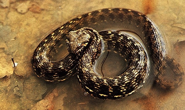 Mit ihrem Zickzackband auf dem Rücken erinnert die harmlose Vipernatter an eine Kreuzotter. Die runde Pupille verrät aber, dass es sich nicht um eine Viper handelt.