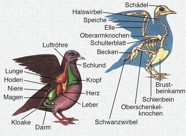 Die Knochen sind kalkreich und fest, aber spröde, dabei besonders leicht. Herz und Blutkreislauf sind vollständig doppelt (Körper- und Lungenkreislauf) wie bei den Säugetieren. Ein Zwerchfell fehlt. Die Lunge ist unelastisch mit fünf Paaren von dünnhäutigen Luftsäcken, die sich zwischen Eingeweiden und bis in die Knochen hinein fortsetzen; daher eine besonders gute Sauerstoffausnutzung. Die Luftröhre ist z. T. länger als der Hals und in einer Schlinge in den Brustbeinkamm gelegt (systematisches Merkmal). Die Stimmen werden fast alle vom unteren Kehlkopf (Syrinx), nicht vom oberen (Larynx) erzeugt (Vogelstimmen). Gehör und Gesicht sind meist vorzüglich. Empfindliche Tastorgane an der Schnabelspitze dienen einigen Vögeln (z. B. Schnepfen) zur Nahrungssuche. Einige Geierarten, Kiwis und Röhrennasen haben auch ein ausgezeichnetes Riechvermögen. Die Augen sind fast immer zur Seite gerichtet; sie können von zwei Lidern und der Nickhaut (vom inneren Augenwinkel her) geschützt werden. Das Farbsehen ist besonders in den langwelligen Bereichen gut ausgebildet. Ein äußeres Ohr ist nicht vorhanden; das Trommelfell liegt frei zu Tage. Das Verhalten der Vögel ist durch viele Instinkthandlungen geprägt (z. B. Vogelzug, Ernährung, Revierbildung und Fortpflanzung).