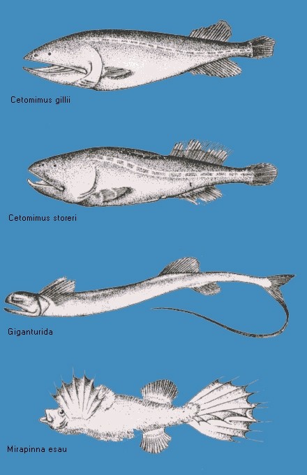 Während die beiden Cetominus-Arten tatsächlich noch einem kleinen Wal ähneln, zeigen die Körperformen der beiden anderen Arten erhebliche Abwandlungen.