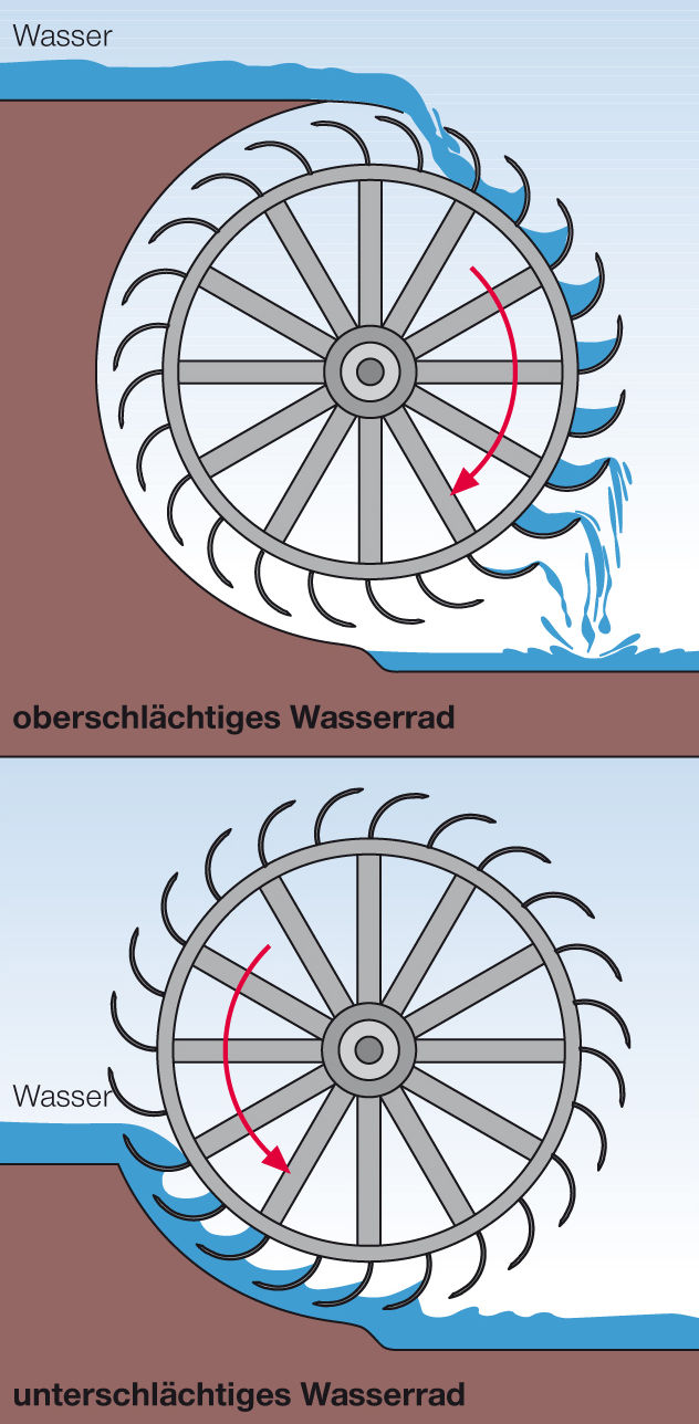 Als unterschlächtig oder oberschlächtig bezeichnet man das Wasserrad, je nachdem, ob das Wasser von unten oder von oben auf das Rad trifft.
