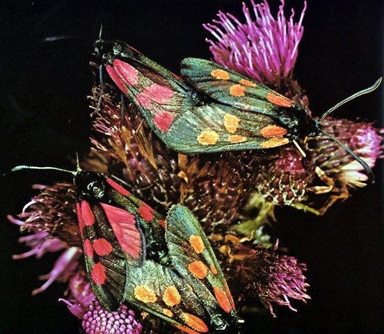 Auf demselben Blütenstand sind oft gleichzeitig mehrere Widderchen anzutreffen, hier zwei Paare von Zygaena lonicerae. Die Weibchen sind etwas blasser gefärbt als die Männchen. Die Arten unterscheiden sich oft nur durch das Fleckenmuster.