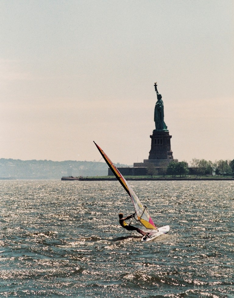 Ein Windsurfer vor der Freiheitsstatue von New York.