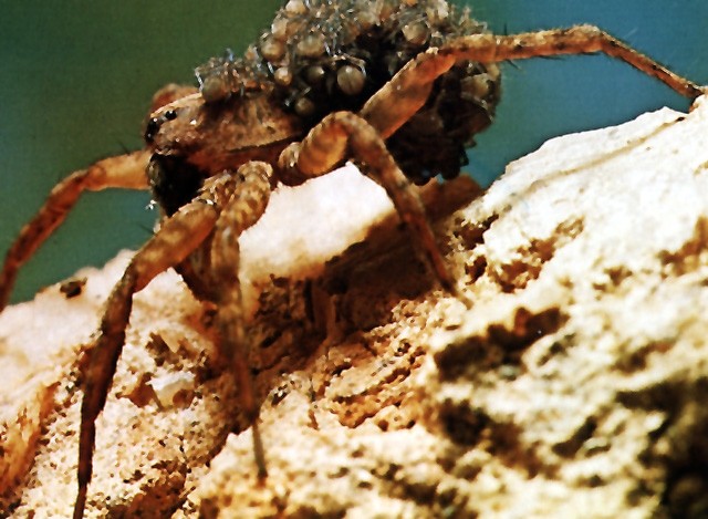 Nachdem die Wolfspinne ihren Eikokon aufgebissen hat, klettern die Jungen auf ihren Hinterleib, wo sie sich dichtgedrängt festklammern. Sie werden vom Muttertier bis nach der ersten Häutung mitgetragen.