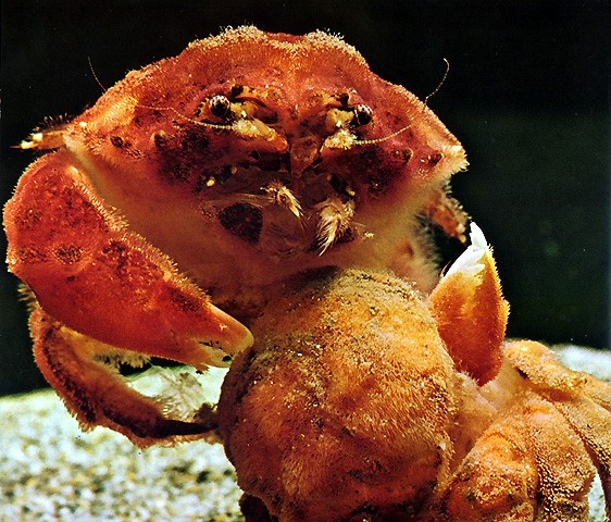 Eine frisch gehäutete, im Mittelmeer heimische Wollkrabbe (Dromia vulgaris) neben ihrem abgeworfenen Panzer.