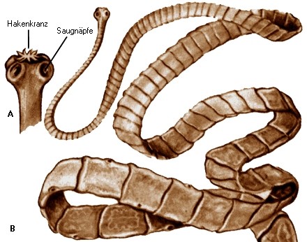 A: Kopf (Skolex), mit dem sich der Bandwurm in der Darmwand verankert. B: Bandwurm mit immer größer werdenden Gliedern (Proglottiden).