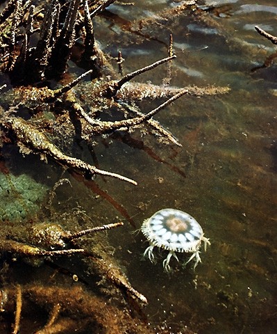 Die zu den Wurzelmundquallen gehörige Flachwassermeduse schwimmt in der Jugendzeit umher, legt sich später aber mit der Schirmoberseite auf den Grund und strudelt so Plankton ein.
