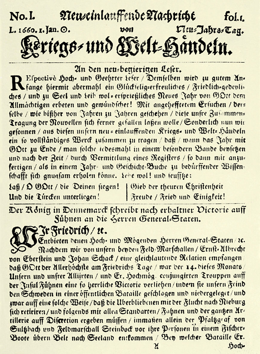 Das Wort Zeitung bedeutete ursprünglich nur Nachricht. Gesammelte und in schneller Folge als Druckschrift veröffentlichte Nachrichten, also Zeitungen im neueren Sinn, gibt es seit 1605 mit der in Straßburg gedruckten „Relation“ bzw. seit 1609 mit dem Wolfenbütteler „Aviso“. 1650 erschienen als erste Tageszeitung die „Einkommenden Zeitungen“ 6-mal wöchentlich in Leipzig. Sehr bald unterwarfen die Landesfürsten die Zeitungen der Zensur und betätigten sich als Zeitungsunternehmer durch Herausgabe von Intelligenzblättern (1727 erstmalig in Preußen: Mitteilungs- und Anzeigenblätter).