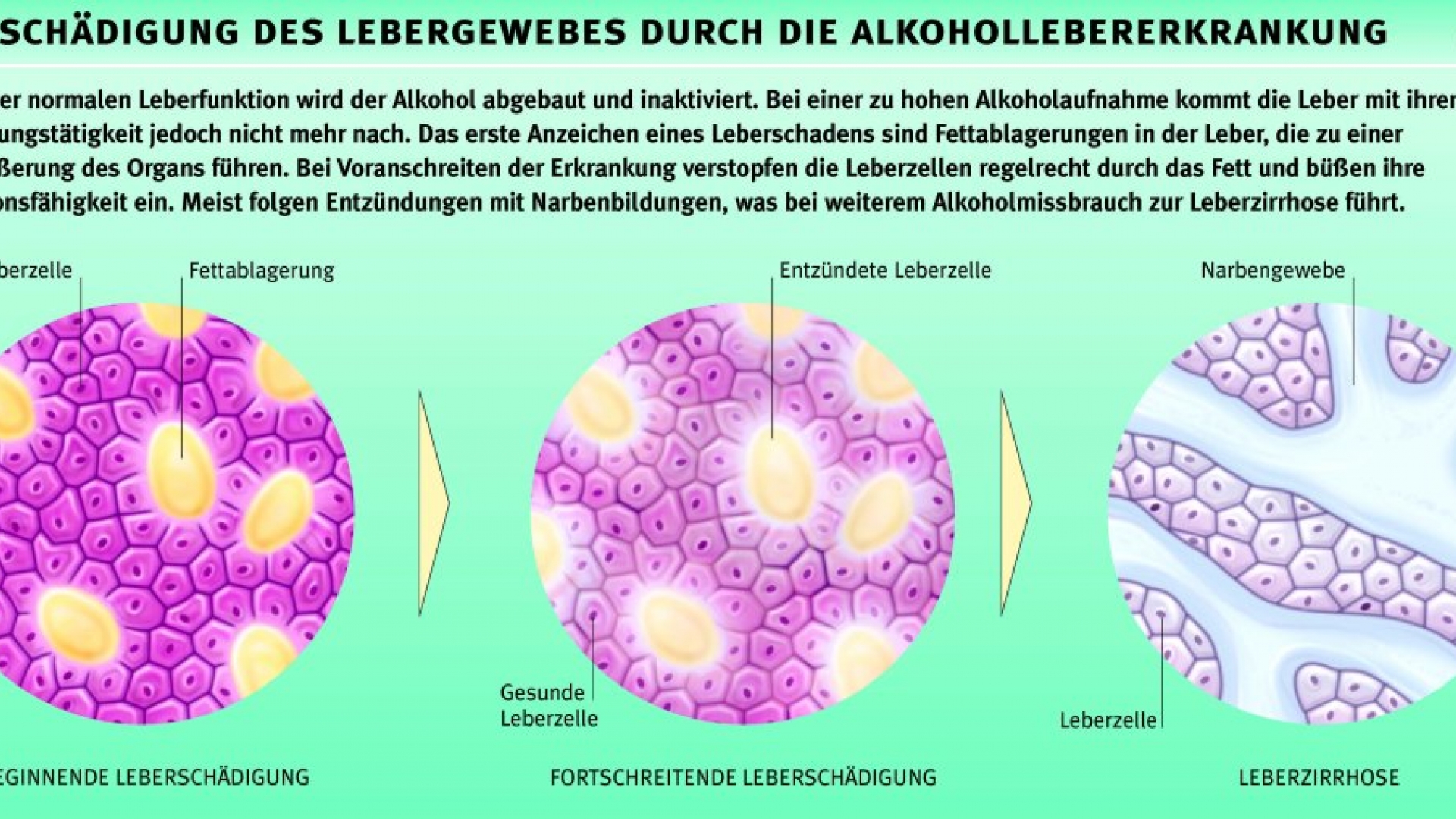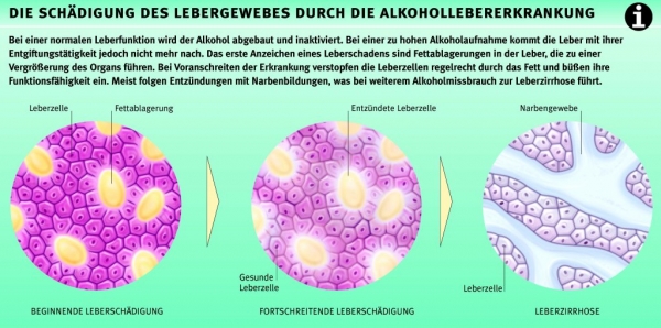 Alkoholismusdie gesundheitliche, psychische und soziale Schädigung eines Menschen durch chronischen Alkoholabusus. Eines der Hauptsymptome der Alkoholkrankheit ist das Auftreten von Entzugserscheinungen bei Abstinenz. Bei den alkoholbedingten Organschäden stehen die Alkoholhepatitis bzw. -fettleber und die Leberzirrhose im Vordergrund. Zu den organischen Manifestationen der Alkoholkrankheit gehören aber auch eine akute oder chronische Pankreatitis, eine Ösophagitis, Gastritis, Kardiomyopathie und Schädigungen des Gehirns oder der Nerven. Zu den körperlichen Schädigungen bringt die Alkoholkrankheit zahlreiche soziale Probleme im privaten Bereich und am Arbeitsplatz mit sich. Die Therapie besteht in einer stationären Alkohol-Entgiftungsbehandlung, gefolgt von einer Entziehungskur, die ambulant oder in einer Fachklinik durchgeführt werden kann. Rückfälle treten häufig auf, sie mindern die langfristigen Erfolgschancen jedoch nicht, so dass weder der Kranke noch seine Angehörigen die Hoffnung auf eine dauerhafte Abstinenz aufgeben sollten. Die Veranlagung zur Alkoholkrankheit bleibt allerdings auch nach erfolgreicher Therapie lebenslänglich bestehen. Ehemalige Alkoholkranke dürfen nie wieder Alkohol trinken, da sonst ein Rückfall in das süchtige Trinken droht. Auch Abhängigkeit, Entzug.