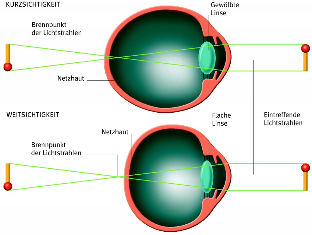 Kurzsichtigkeit ist die Folge eines zu langen Augapfels oder einer zu stark gewölbten Linse. Dadurch vereinigen sich die Lichtstrahlen vor der Netzhaut. Weiter entfernte Gegenstände erscheinen daher verschwommen. Bei Weitsichtigkeit ist entweder der Augapfel zu kurz oder die Linse zu flach, so dass der Brennpunkt der eintreffenden Lichtstrahlen hinter der Netzhautebene liegen würde. Gegenstände in der Nähe erscheinen deshalb unscharf.