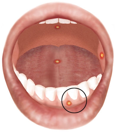 rundliche, zum Teil etwas erhabene, weißliche Veränderung an Schleimhäuten, die einzeln oder zu mehreren vorkommen kann und stark schmerzt. Bei Aphthen im Mund bereitet das Essen Schmerzen, z. B. bei der Stomatitis aphthosa. Auch an den äußeren Geschlechtsorganen können Aphthen auftreten, z. B. bei viralen Erkrankungen. Aphthen können jedoch auch unabhängig von einer Erkrankung auftreten, z. B. bei hormonellen Störungen. In der Regel heilen Aphthen innerhalb weniger Tage ab.