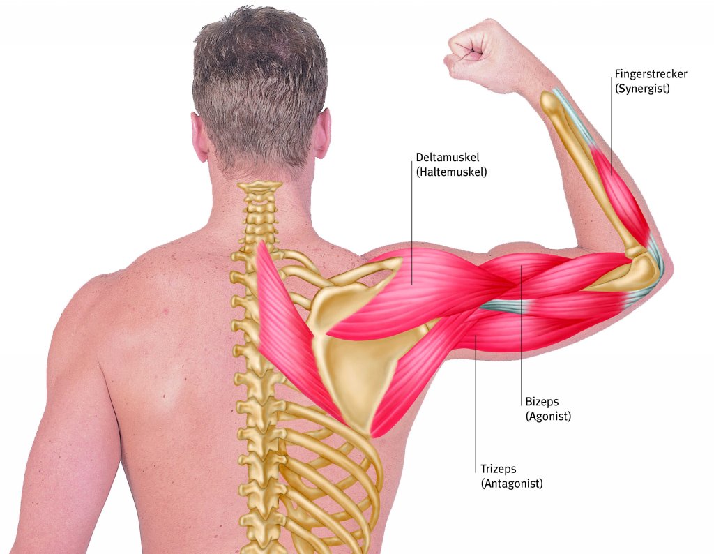 Die Armmuskeln sind ein gutes Beispiel für das Zusammenwirken von Muskelgruppen. Bizeps und Trizeps werden eingesetzt, um den Arm vom Körper weg zu bewegen. Bei der Aufwärtsbewegung kontrahiert der Bizeps, bei der Abwärtsbewegung kontrahiert der Trizeps und zieht den Arm in die entgegengesetzte Richtung.