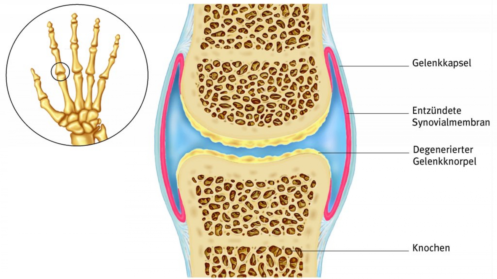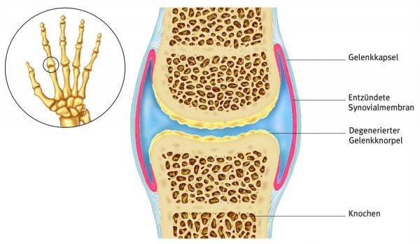 Bei der rheumatoiden Arthritis entzündet sich zunächst die Synovialmembran. Der Entzündungsprozess greift auf Gelenk und Knochen über und es kommt zur Erosion von Knorpelgewebe und Bändern. Das Gelenk versteift, Schwellungen und Deformierungen beeinträchtigen die Bewegungsfreiheit.