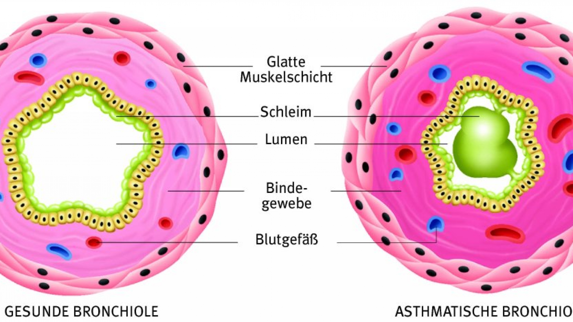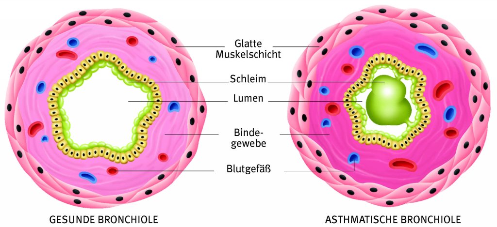 Asthma entsteht durch eine Verengung und Entzündung der Bronchiolen, der kleinen Abzweigungen der Bronchien in der Lunge. Es äußert sich durch wiederholte Anfälle von Atemnot und durch pfeifende Atemgeräusche. Durch die erhöhte Schleimhautaktivität entsteht ein außergewöhnlich zähflüssiger und klebriger Schleim.