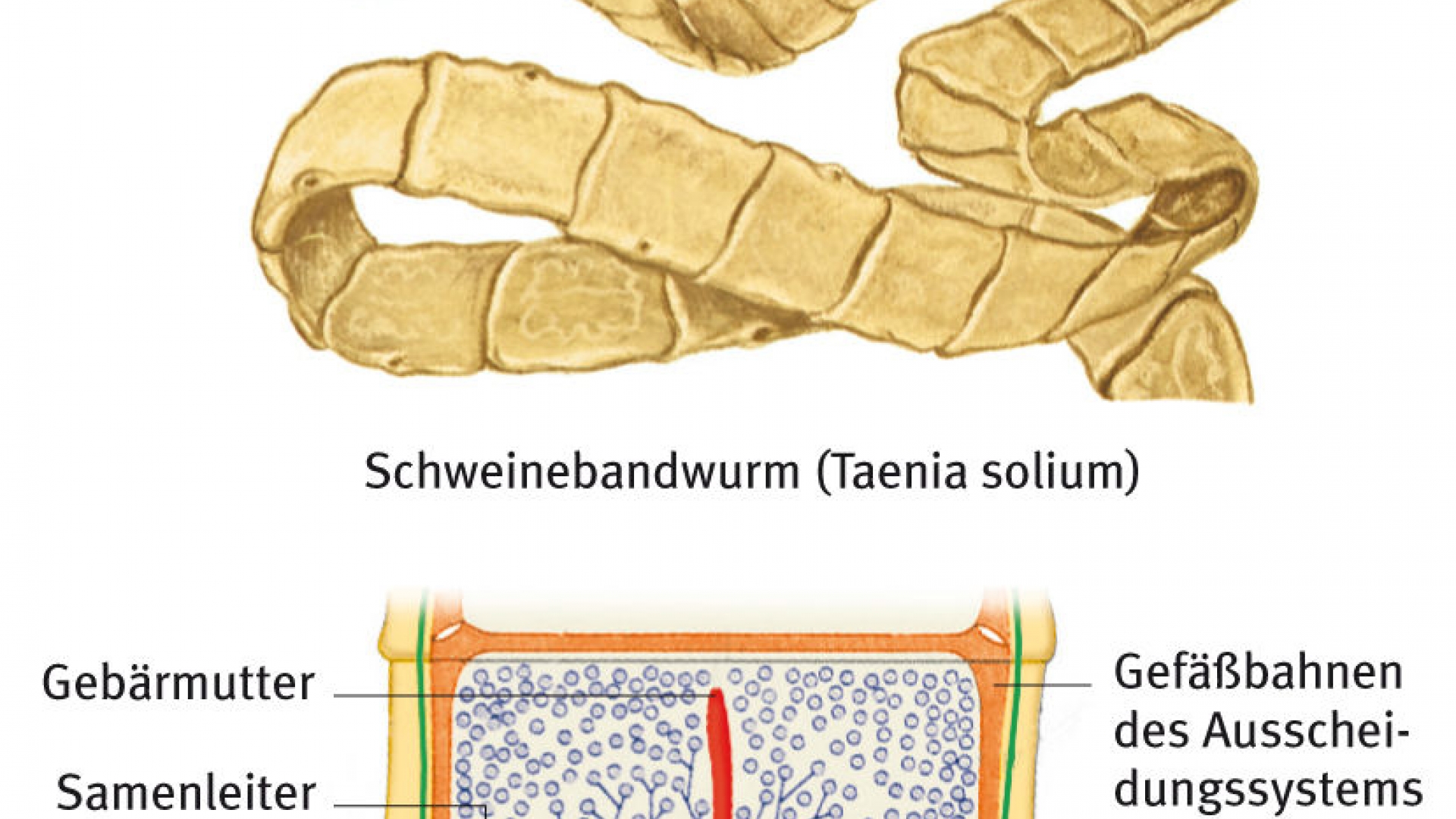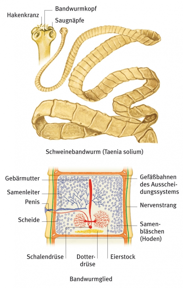 BandwurmWurm aus der Gattung Cestodes (Bandwürmer), die verschiedene Arten umfasst (z. B. Taenia oder Echinococcus). Bandwürmer befallen Menschen und Tiere, leben im Darm des Wirts und können über die Blut- oder Lymphbahnen auch in Organe eindringen. Die Ansteckung erfolgt meist über die Nahrung oder mit dem Trinkwasser. Die Bandwürmer bestehen aus Kopf, Hals und einer Gliederkette, die bis zu 15 Meter lang werden kann. Ein Befall mit Bandwürmern kann ohne Beschwerden einhergehen oder auch unspezifische Beschwerden wie Heißhunger, Appetitlosigkeit oder Abmagerung auslösen. Auch Fischbandwurm, Echinokokkus.