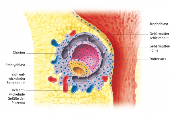 Zottenhautmittlere Eihaut. Das Chorion entsteht u. a. aus dem Trophoblasten, einem Entwicklungsstadium der befruchteten Eizelle, und dem anliegenden Mesenchym. Die sich entwickelnden Zottenbäume bilden gemeinsam mit der Dezidua basalis die Plazenta. Die Dezidua entwickelt im schwangeren Uterus aus der Gebärmutterschleimhaut (Endometrium). Das Chorion produziert das humane Choriongonadotropin (HCG), das beim Schwangerschaftstest im Urin nachgewiesen wird.
