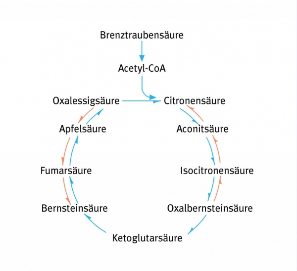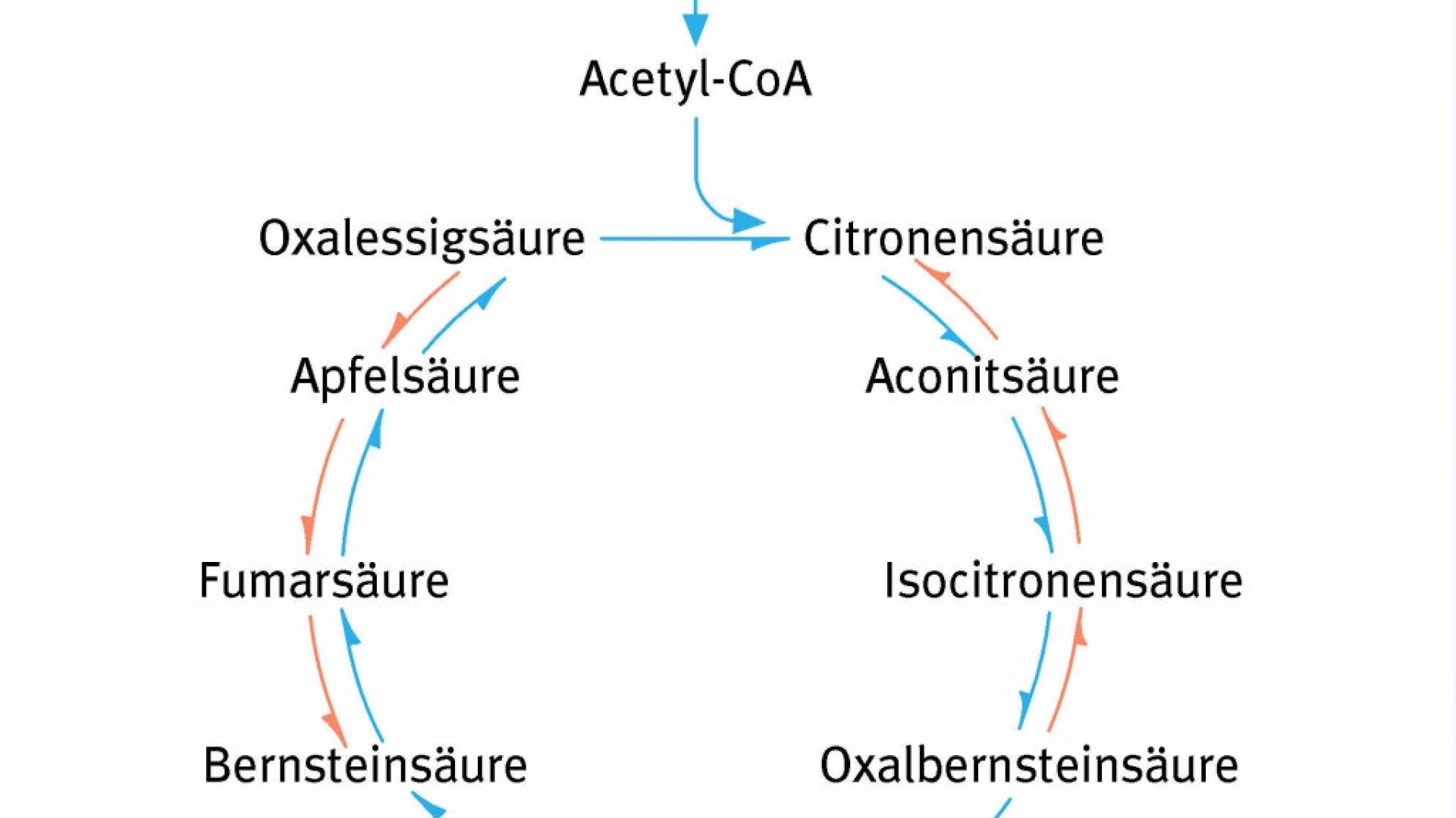 Zitronensäurezyklus; KrebszyklusZitratzyklus, zentrale Stoffwechselreaktion, bei der unter Verbrauch von Kohlenhydraten, Fetten und Eiweiß schließlich Energie in Form von Adenosintriphosphat (ATP) entsteht. Zitrat ist eines der zahlreichen Zwischenprodukte dieses Zyklus, aus dessen Reaktionen freier Wasserstoff entsteht, der in der sog. Atmungskette mit Sauerstoff verbunden wird: Durch diesen Schritt wird die Bildung von ATP möglich. Bei der Spaltung von ATP wird Energie frei und kann für andere Reaktionen genutzt werden.