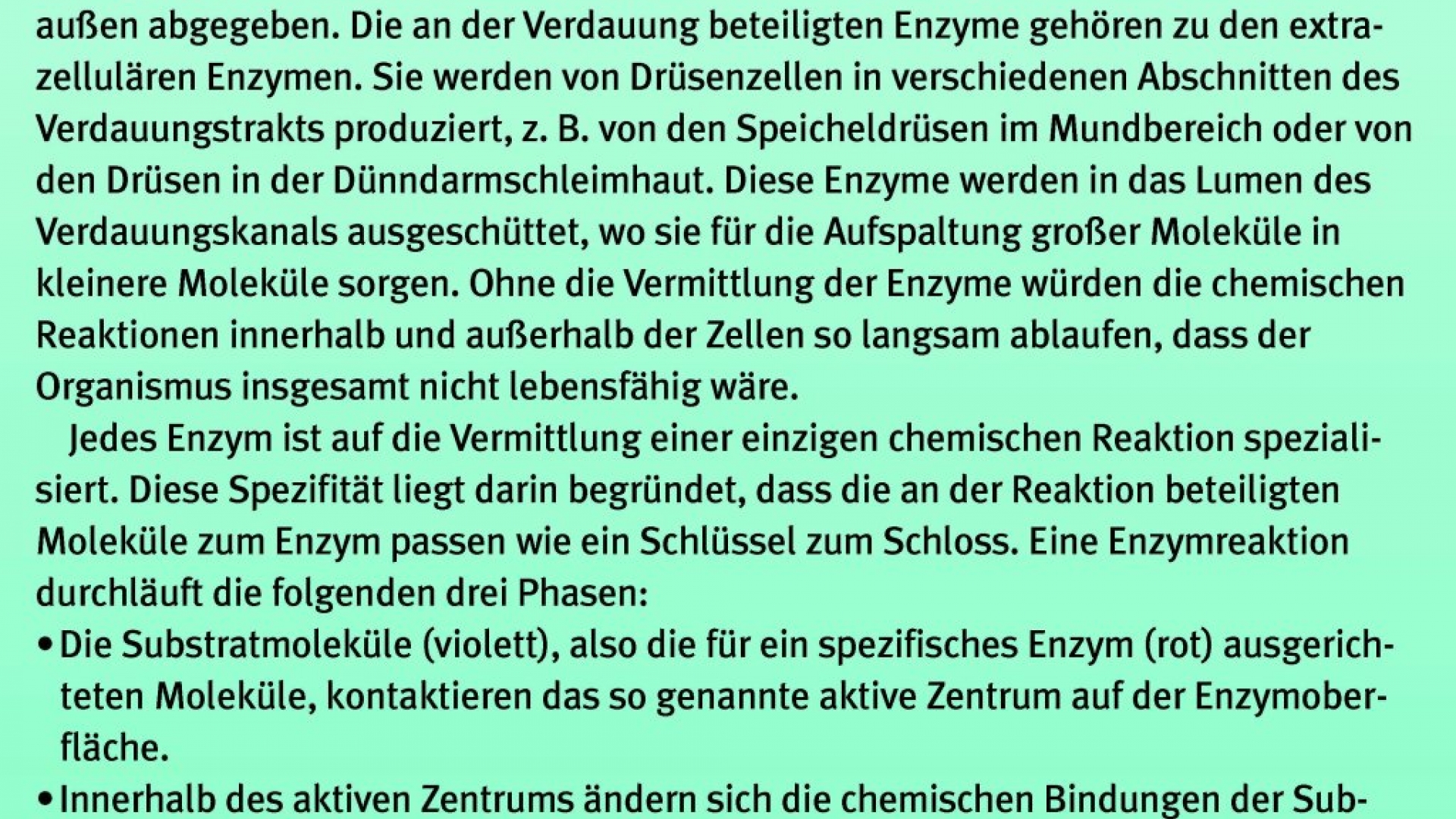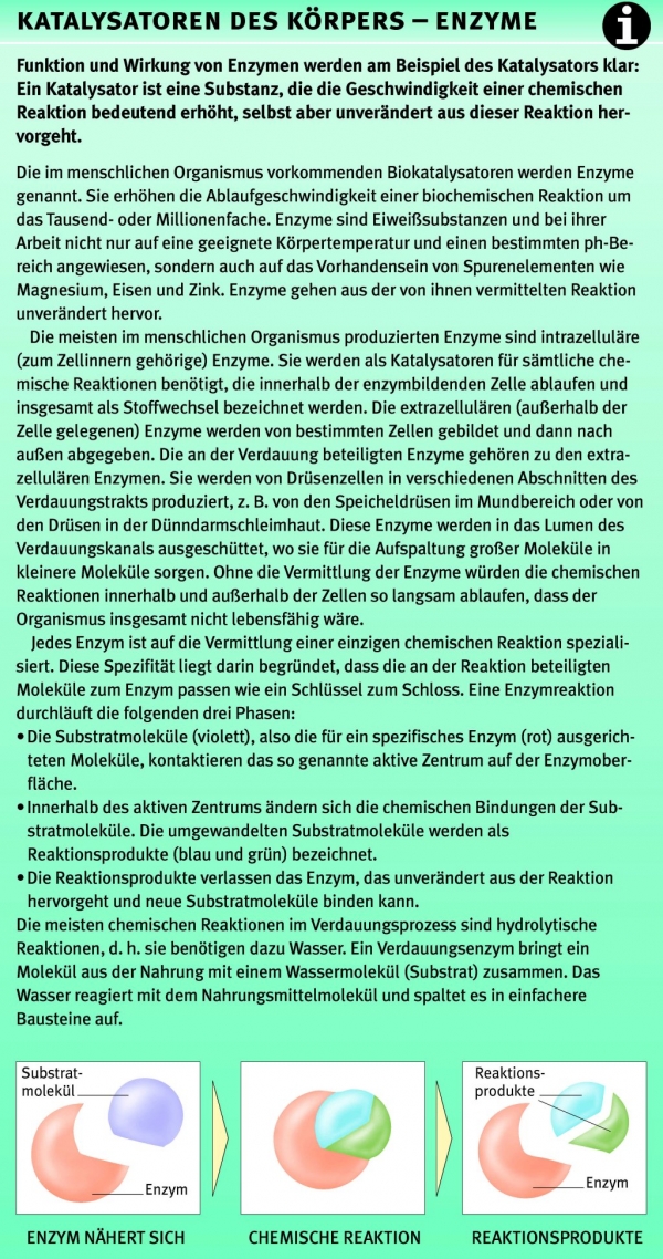 Fermentein Protein, das chemische Reaktionen als Biokatalysator beschleunigt. Im Organismus sind Enzyme bei der Synthese von Zellen, in der Regulation von Stoffwechselvorgängen und in der Verdauung von großer Bedeutung. Enzyme ermöglichen den Ablauf dieser Prozesse mit höherer Geschwindigkeit und niedrigerer Aktivierungsenergie, ohne dabei den chemischen Prozess zu verändern.