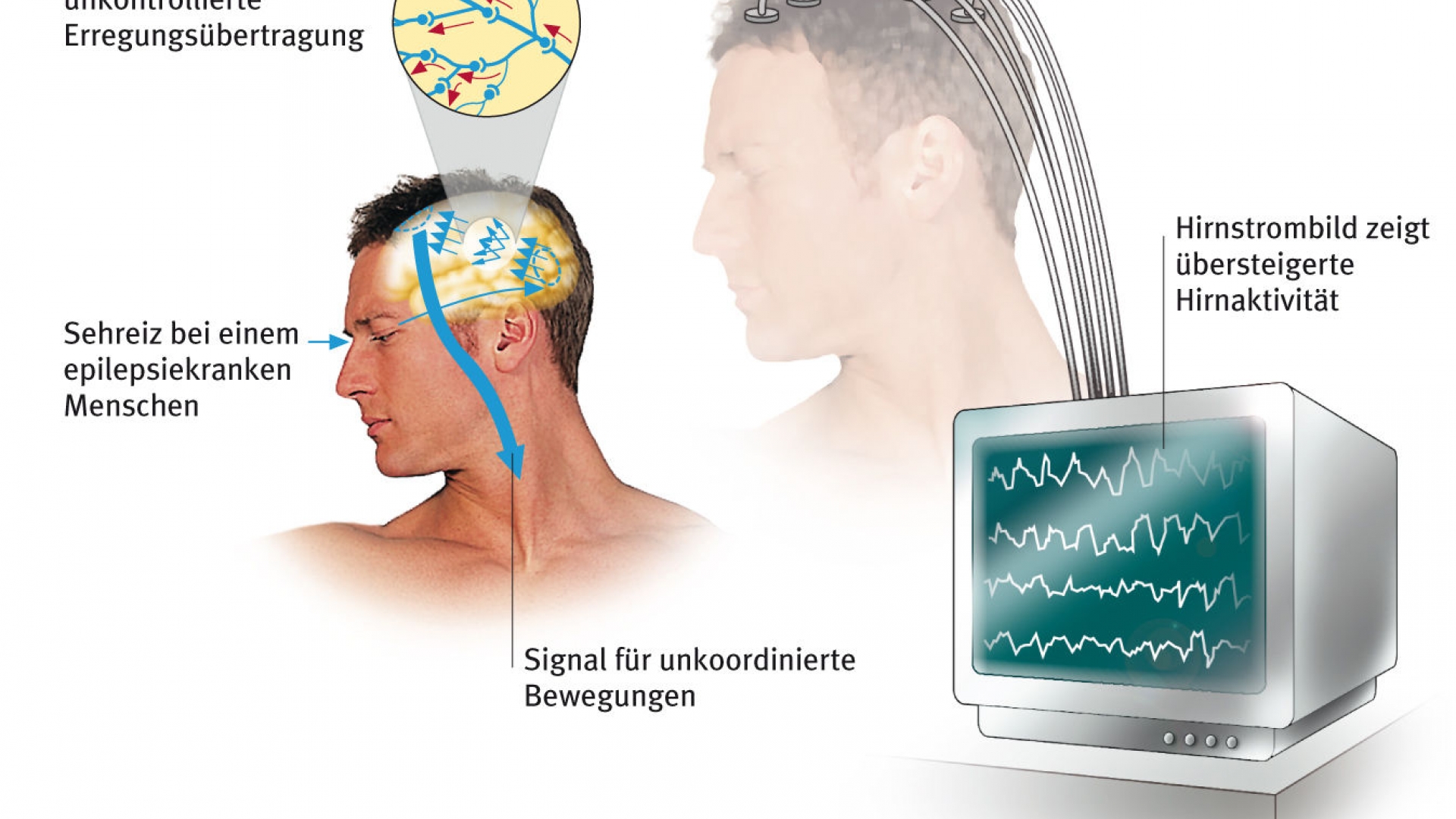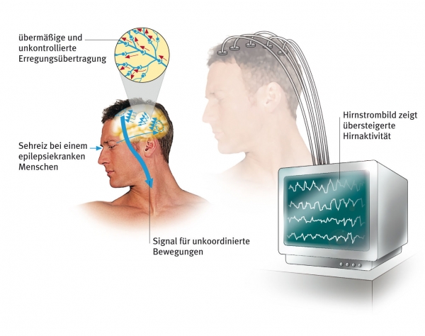 wiederholtes Auftreten von epileptischen Krampfanfällen. Ein epileptischer Krampfanfall ist eine übermäßig starke Entladung von Neuronen im Gehirn ("Gewitter im Gehirn"), das zu Zuckungen, Muskelkrämpfen, kurzzeitigem Bewusstseinsverlust oder auch Dämmerzuständen führen kann. Für die Entstehung einer Epilepsie sind äußere Faktoren (Erkrankungen des Gehirns durch Trauma, Tumor usw.) oder eine Veranlagung (genetische Einflüsse, Stoffwechselstörungen) verantwortlich. Die Epilepsie wird unterteilt in fokale Anfälle (nur eine bestimmte Hirnfunktion fällt kurzfristig aus und führt z. B. zum Zucken eines Armes, sog. Petit mal) und generalisierte Anfälle (Absencen oder über den ganzen Körper verlaufende Krämpfe, sog. Grand-mal-Anfälle). Einem epileptischen Anfall können sog. Prodromi oder Vorboten vorausgehen (Aura). Während eines Anfalls sind im Elektroenzephalogramm typische Veränderungen der Hirnaktivität sichtbar. Die Therapie einer Epilepsie besteht aus Prävention (Vermeiden von Schlafmangel usw.) und einer langfristigen Medikation mit sog. Antiepileptika. Auch Krampfanfall.