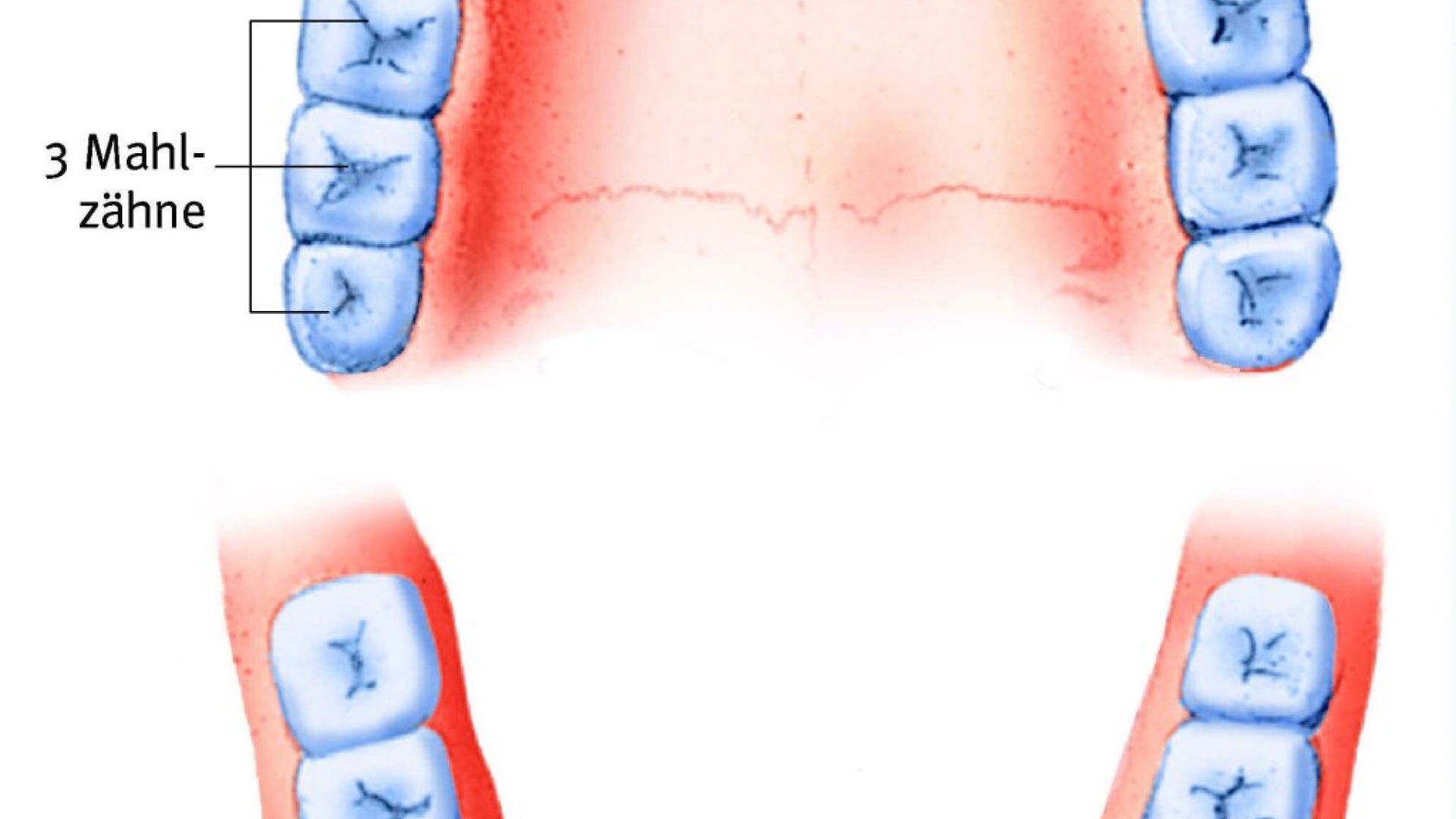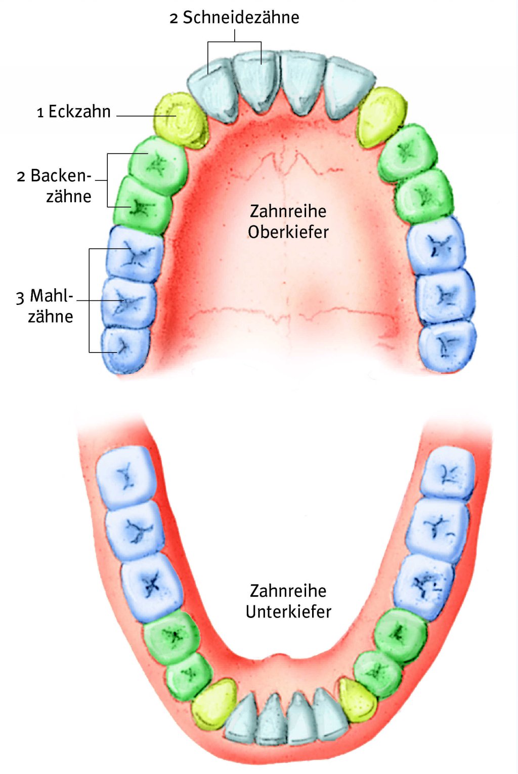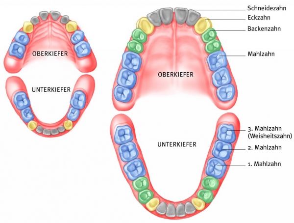 Die ersten Zähne brechen etwa im Alter von sechs Monaten durch. Das so genannte Milchgebiss ist im Alter von etwa drei Jahren vollständig. Mit ungefähr sechs Jahren werden die Milchzähne allmählich von den bleibenden Zähnen ersetzt. Das bleibende Gebiss, das aus 32 Zähnen besteht, ist mit dem Erscheinen des dritten Mahlzahnpaars, den so genannten Weisheitszähnen, vollständig. Dies geschieht in der Regel zwischen dem 17. und 21. Lebensjahr.