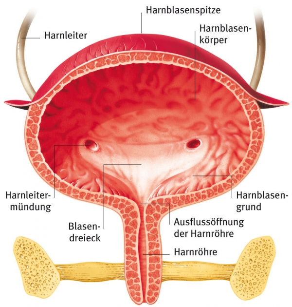 Vesica urinariaein muskulöses, dehnbares Hohlorgan im kleinen Becken, das der Speicherung und Ausscheidung von Harn dient. In der Harnblase wird der Urin aus den Harnleitern gesammelt und bei der Miktion durch die Harnröhre entleert. Das Füllungsvolumen ist individuell unterschiedlich, liegt jedoch im Mittel bei ca. 350 Milliliter. Man unterscheidet die Blasenspitze (Apex), den Blasenkörper (Corpus) und den Blasengrund (Fundus). Der Blasenfundus enthält ein dreieckiges glattes Feld (Trigonum vesicae), dessen Eckpunkte von den Einmündungsstellen der Harnleiter und die Ausflussöffnung der Harnröhre (Urethra) gebildet werden.