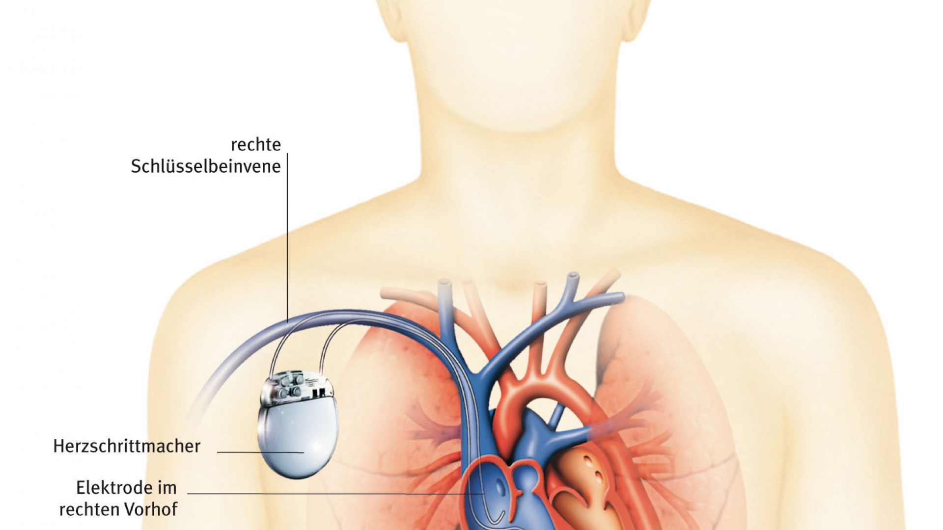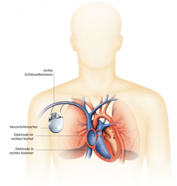 künstlicher Herzschrittmacher: Pacemaker, Schrittmacher, ein elektronischer Impulsgenerator, der zur Elektrostimulation des Herzmuskels eingesetzt wird, vor allem bei Herzrhythmusstörungen mit zu geringer Herzfrequenz ( Herzrhythmusstörungen, bradykarde). Zur vorübergehenden Schrittmachertherapie kann ein externer Schrittmacher verwendet werden, der die Impulse über äußerlich angebrachte Elektroden auf das Herz überträgt. Interne, dauerhafte Schrittmacher sind kleine, batteriebetriebene Generatoren, die ins Unterhautfettgewebe eingepflanzt werden. Sie sind mit Elektroden verbunden, die über eine große Vene zum Herzen führen und dort verankert sind. Der Impuls wird vom Generator über die Elektrode an den Herzmuskel übertragen und löst so eine Herzaktion aus. Es gibt Herzschrittmacher, die eine konstante Herzfrequenz (Festfrequenz-Herzschrittmacher) induzieren und solche, die sich nach der Reizbildung im Herzmuskel richten (Demand-Schrittmacher). Auch Schrittmacherimplantation.