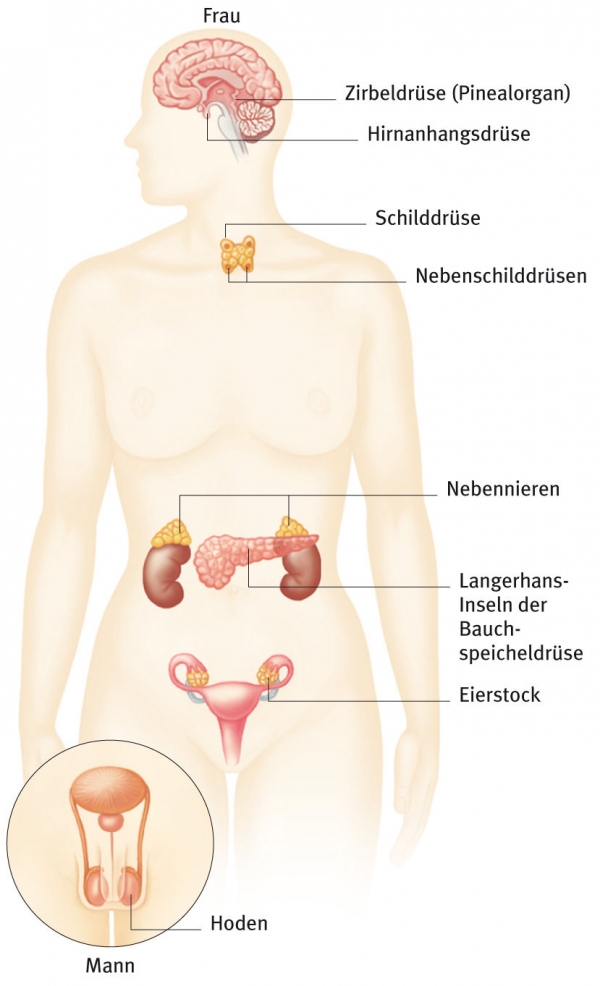 chemischer Botenstoff des endokrinen Systems. Hormone entstehen in endokrinen Drüsen oder speziellen Zellgruppen (z. B. den Inselzellen der Bauchspeicheldrüse). Sie werden mit dem Blutstrom vom Ort ihrer Bildung zu allen Organen transportiert. Hormone wirken spezifisch durch die Bindung an einen entsprechenden Hormonrezeptor. Die Bindung löst eine Informationsübertragung an das Erfolgsorgan aus. Hormone wirken in zahlreichen Regelkreisen des Körpers mit. Meist wird die Hormonausschüttung durch einen Reiz im Gehirn ausgelöst. Die Hormonausschüttung des Hypothalamus wirkt sich auf die Hormonausschüttung der Hypophyse (Vorder- oder Hinterlappen) aus. Die Hormone der Hypophyse fördern oder unterdrücken die Hormonbildung in den peripheren endokrinen Drüsen. Man teilt die Hormone abhängig von ihrem Bildungsort ein in neurosekretorische (von Nervenzellen wie z. B. dem Hypothalamus abgesonderte) bzw. glanduläre (aus endokrinen Drüsen freigesetzte) Hormone und Gewebshormone. Gewebshormone haben meist nur lokale, d. h. auf den Ort ihrer Freisetzung begrenzte Wirkungen. Nach ihrem chemischen Aufbau werden folgende Hormone unterschieden: