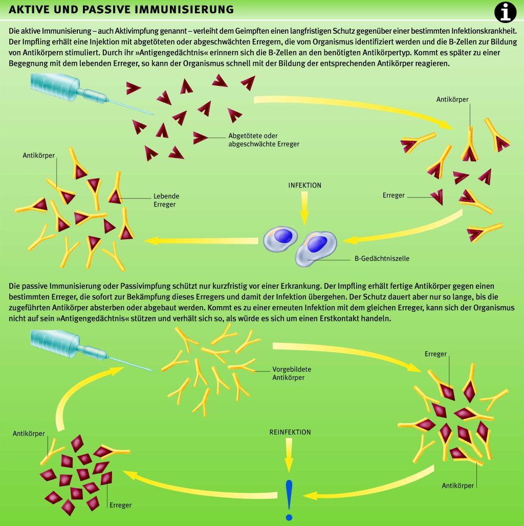 künstliche Auslösung einer Immunantwort des Organismus durch Einschleusung abgeschwächter Krankheitserreger oder Erregergifte. Die aktive Impfung erfolgt entweder oral als Schluckimpfung (z. B. gegen Poliomyelitis), subkutan oder intramuskulär mittels Injektion, Impflanzette oder -pistole. Um eine ausreichende Immunität zu erreichen, sind nach der Grundimmunisierung in bestimmten Abständen Auffrischimpfungen notwendig. Eine aktive Impfung ist gegen zahlreiche Infektionskrankheiten möglich, z. B. Pocken, Poliomyelitis, Masern, Mumps, Röteln, Tetanus usw. Der Impfschutz hält manchmal lebenslänglich an, bei anderen ist nach fünf bis zehn Jahren eine Auffrischungsimpfung angebracht, z. B. gegen Tetanus.
