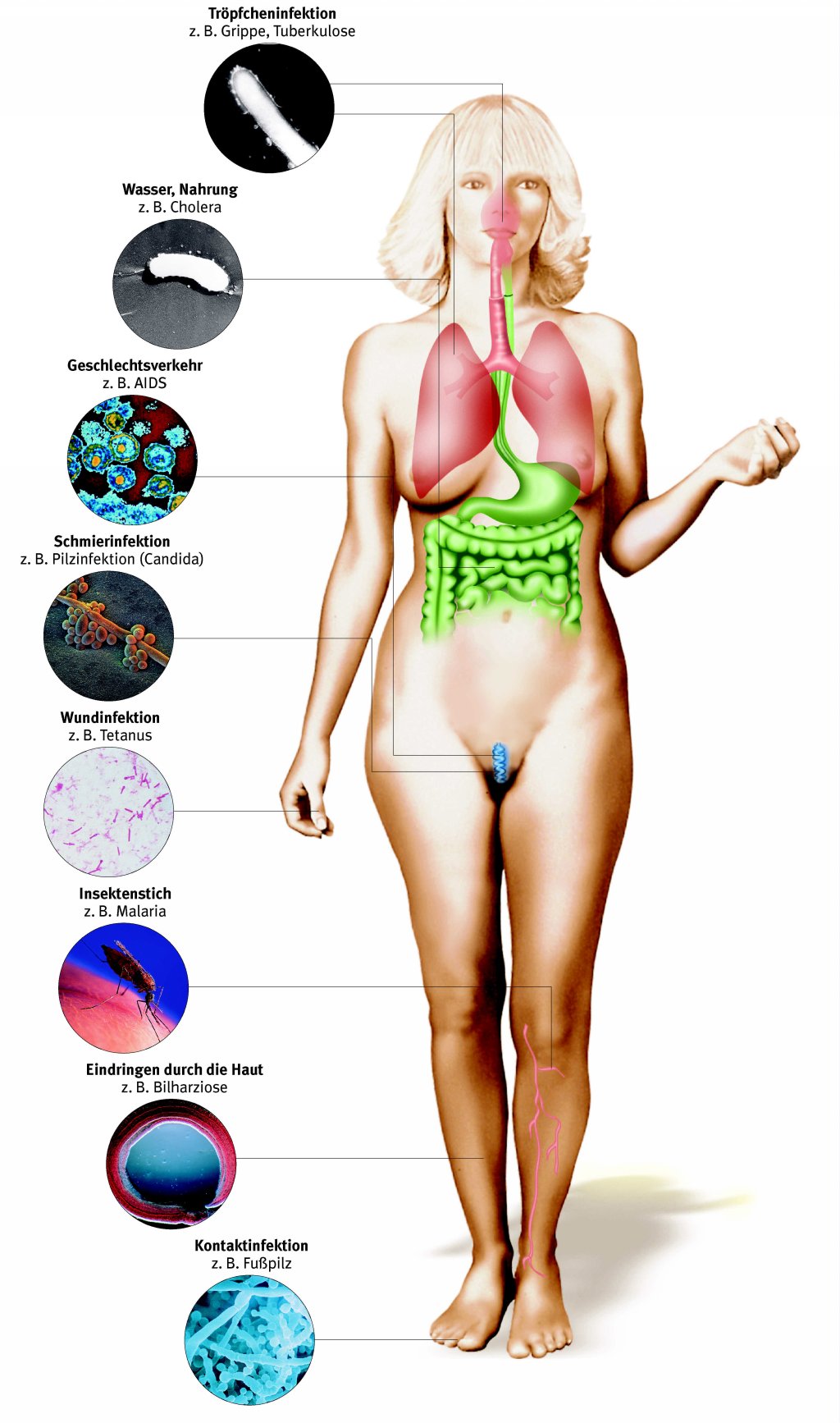 Typische Infektionswege: Erreger können entweder von Mensch zu Mensch oder über Zwischenträger oder -wirte übertragen werden. Eine Schmierinfektion z.B. kann durch feuchte Handtücher erfolgen. Beim Niesen und Husten werden infektiöse Tröpfchen weitergegeben. Mit Staub und Erde können Erreger in eine offene Wunde geraten und über Wasser und Nahrung gelangen Keime direkt in den Magen-Darm-Trakt. Direkter Schleimhaut- oder Blutkontakt kann beim Geschlechtsverkehr eine Ansteckung zur Folge haben. Insekten können Erreger direkt ins Blut einbringen. Viele Parasiten dringen aktiv in den Körper ein.