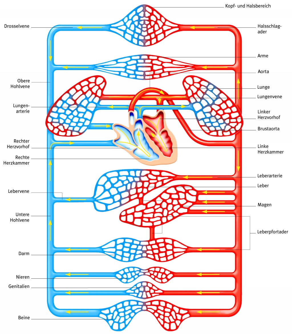 Das Blutkreislaufsystem umfasst neben dem Herzen das gesamte Netzwerk der Blutgefäße. Es transportiert sauerstoffreiches Blut vom Herzen in sämtliche Körperbereiche und leitet sauerstoffarmes Blut zum Herzen zurück, von wo es zur Lunge gepumpt und von neuem mit Sauerstoff angereichert wird.