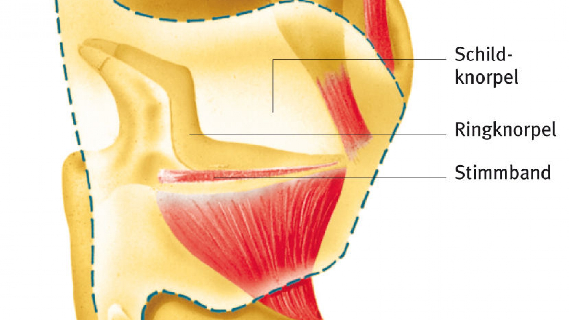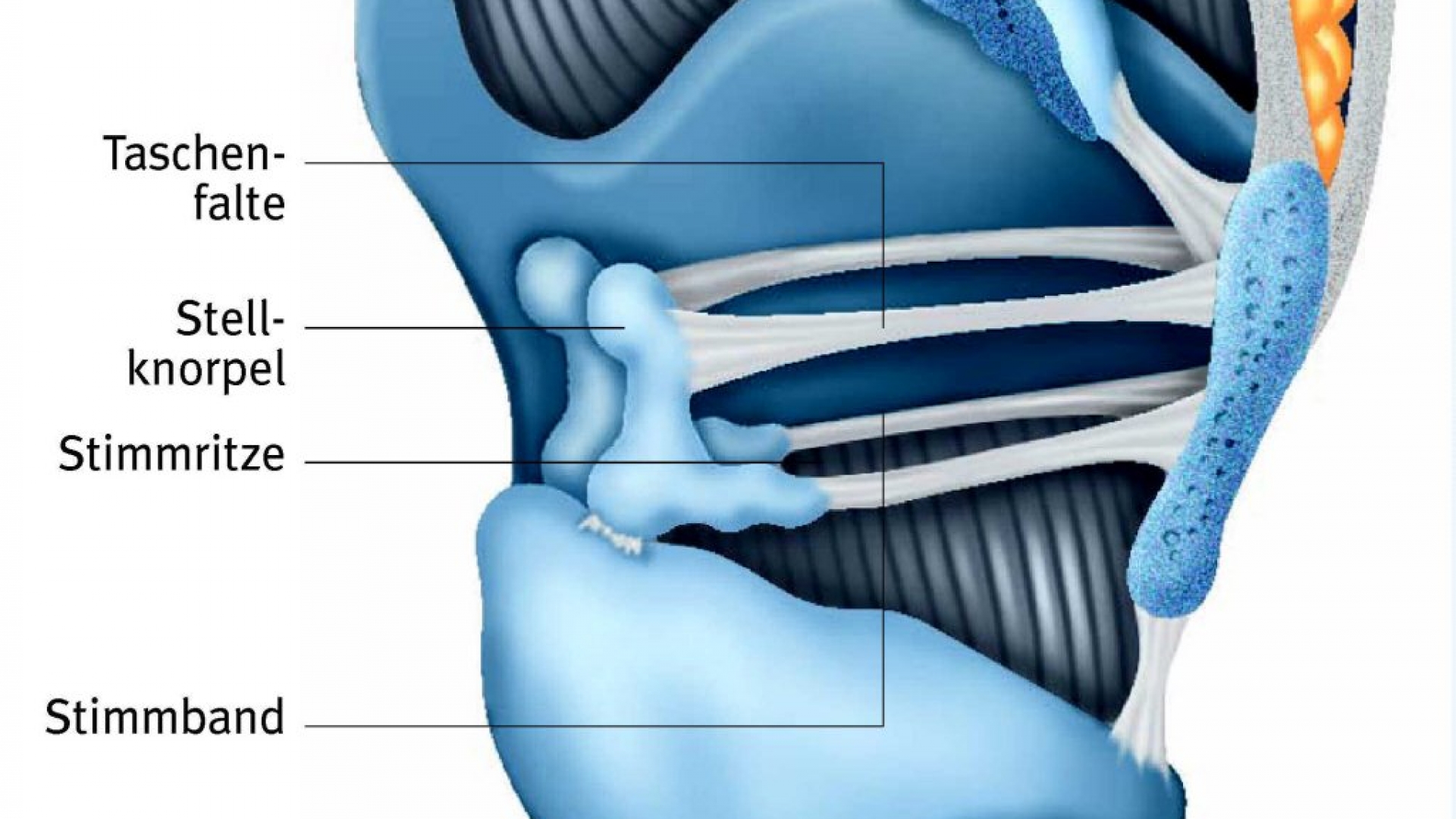 Der Kehlkopf verbindet den Rachen mit der Luftröhre. Die Stimmbänder erstrecken sich quer durch den Kehlkopf. Sie geraten beim Ausatmen in Bewegung und ermöglichen uns die Bildung von Lauten. Über den eigentlichen Stimmbändern liegen die aus faserigem Gewebe bestehenden Taschenfalten oder falschen Stimmbänder. Diese schließen sich während des Schluckaktes und verhindern das Eindringen von Nahrungspartikeln in die Luftröhre.