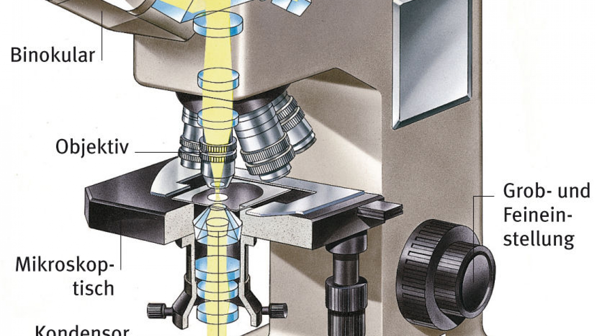 technisches Gerät zur Vergrößerung sehr kleiner Objekte mit Hilfe von sichtbaren Lichtstrahlen. Die bildliche Vergrößerung wird von zwei Linsensystemen, dem Objektiv und dem Okular, geleistet. Für die unterschiedliche Vergrößerung der Bilder können diese Linsen ausgetauscht werden. Um die Lichtablenkung zu vermindern, wird ein Tropfen Immersionsöl zwischen Objekt und Objektiv gegeben, das einen übergangsfreien optischen Kontakt ermöglicht. Bei Bestrahlung des Objekts von oben, z. B. bei undurchsichtigen Objekten, spricht man von Auflichtmikroskopie, bei der Bestrahlung von unten, z. B. bei dünnen, transparenten Gewebeschnitten, von Durchlichtmikroskopie. Das Lichtmikroskop ist in der Medizin und anderen Naturwissenschaften, vor allem in der Biologie, ein unentbehrliches Hilfsmittel.